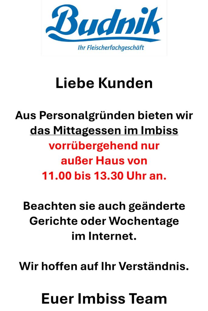 Der Imbiss ist voraussichtlich vom 09.09. – 19.09.2025 wegen Krankheit geschlossen!